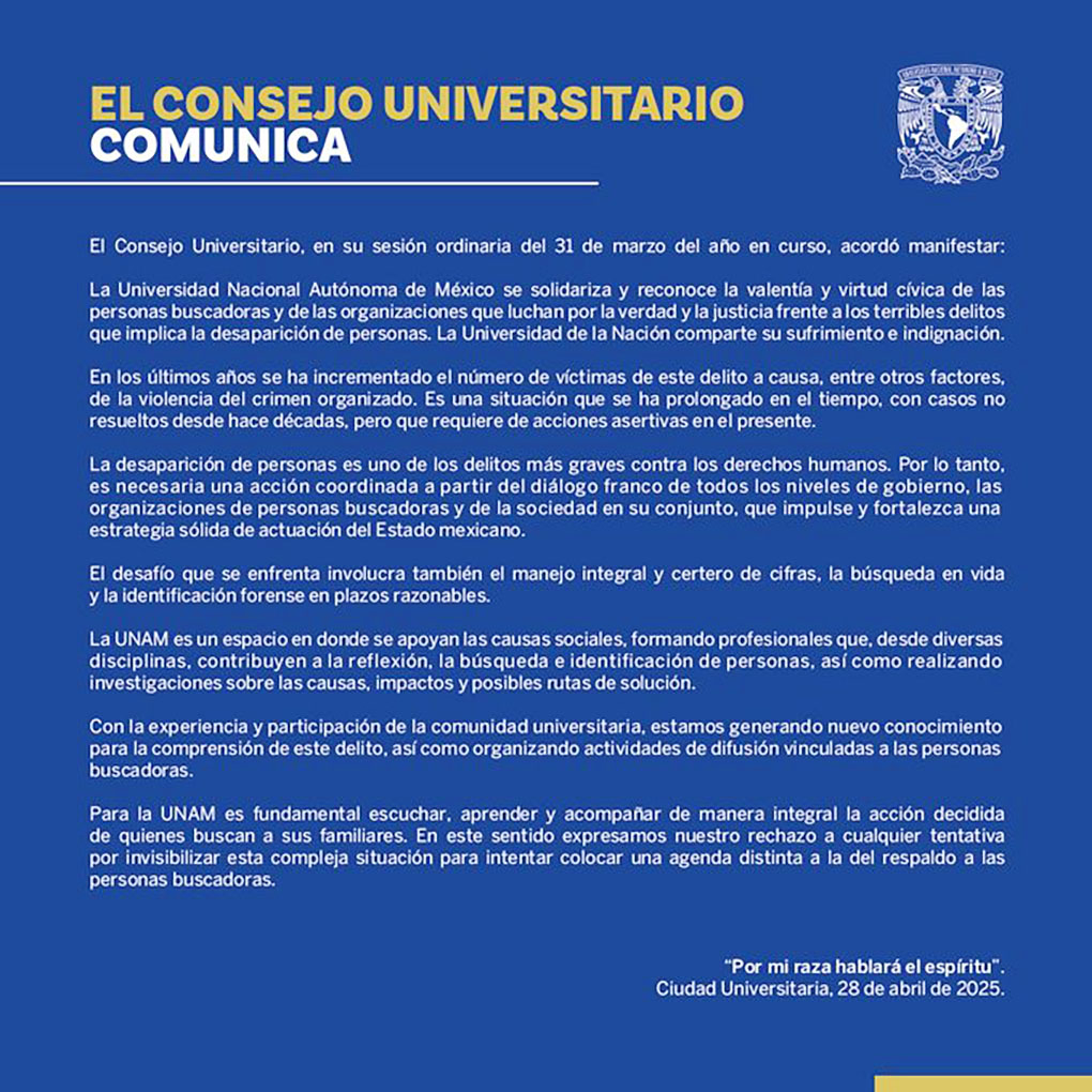 UNAM se pronuncia sobre crisis de desapariciones por el crimen