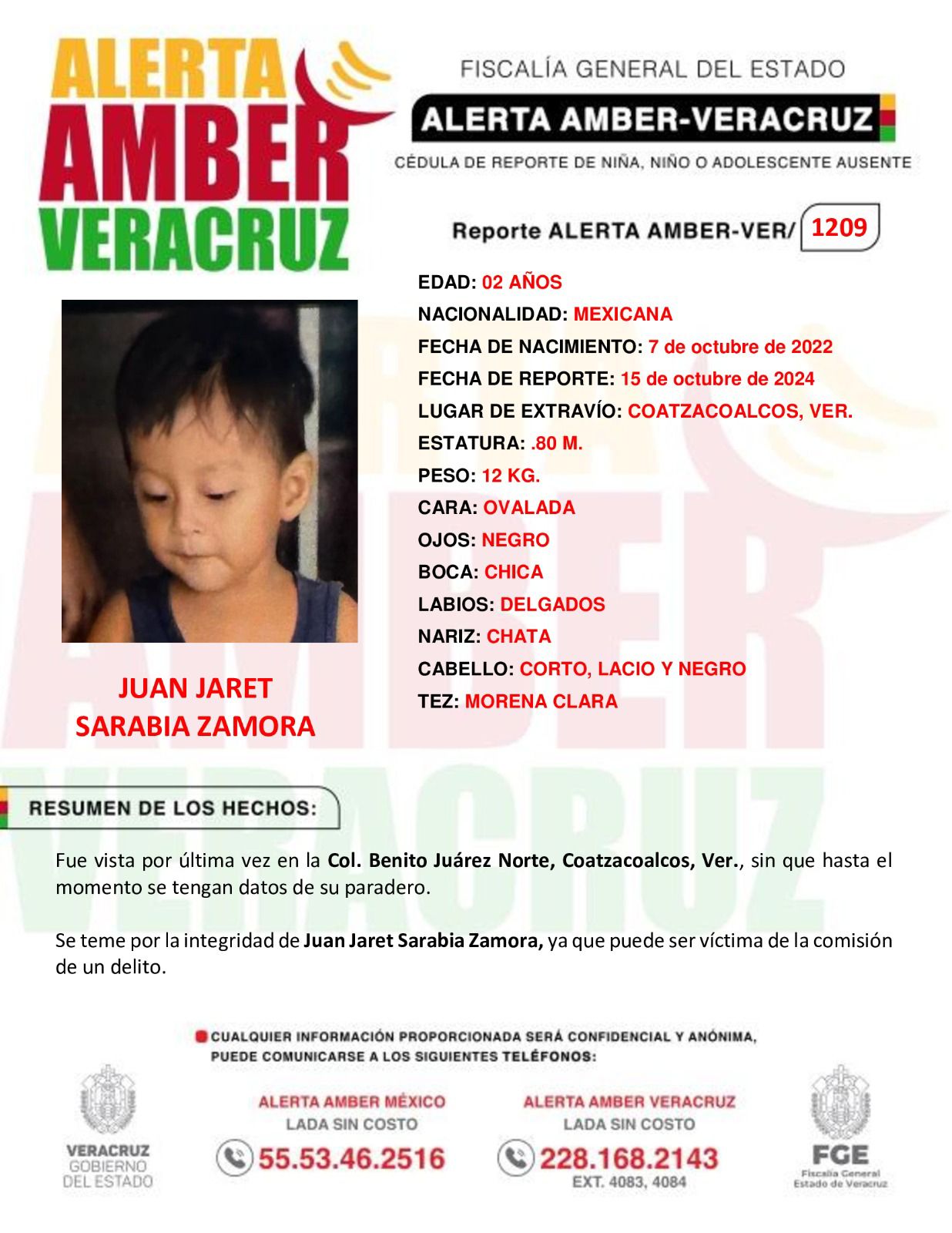 Activan alerta amber por privación ilegal de la libertad de un niño de 2 años en Coatzacoalcos