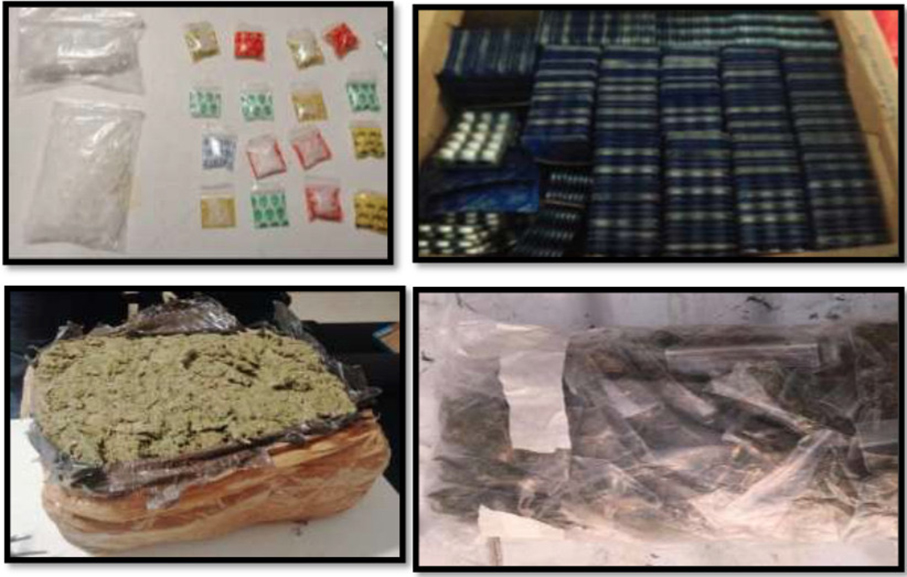 Les incautaron 33 dosis de marihuana, 39 de cristal, 5.2 kg de marihuana, 4 mil 365 pastillas de metilfenidato, un fusil M4 calibre .223, un revólver Colt calibre 38 especial, una pistola Smith & Wesson 9 mm, 138 cartuchos últiles y dos cadenas “ponchallantas”. También un Honda Civic, placas GZU321C de Guerrero, un Chevrolet Chevy, láminas YJV7386 de Veracruz, y una motocicleta Italika 150, sin placas.
