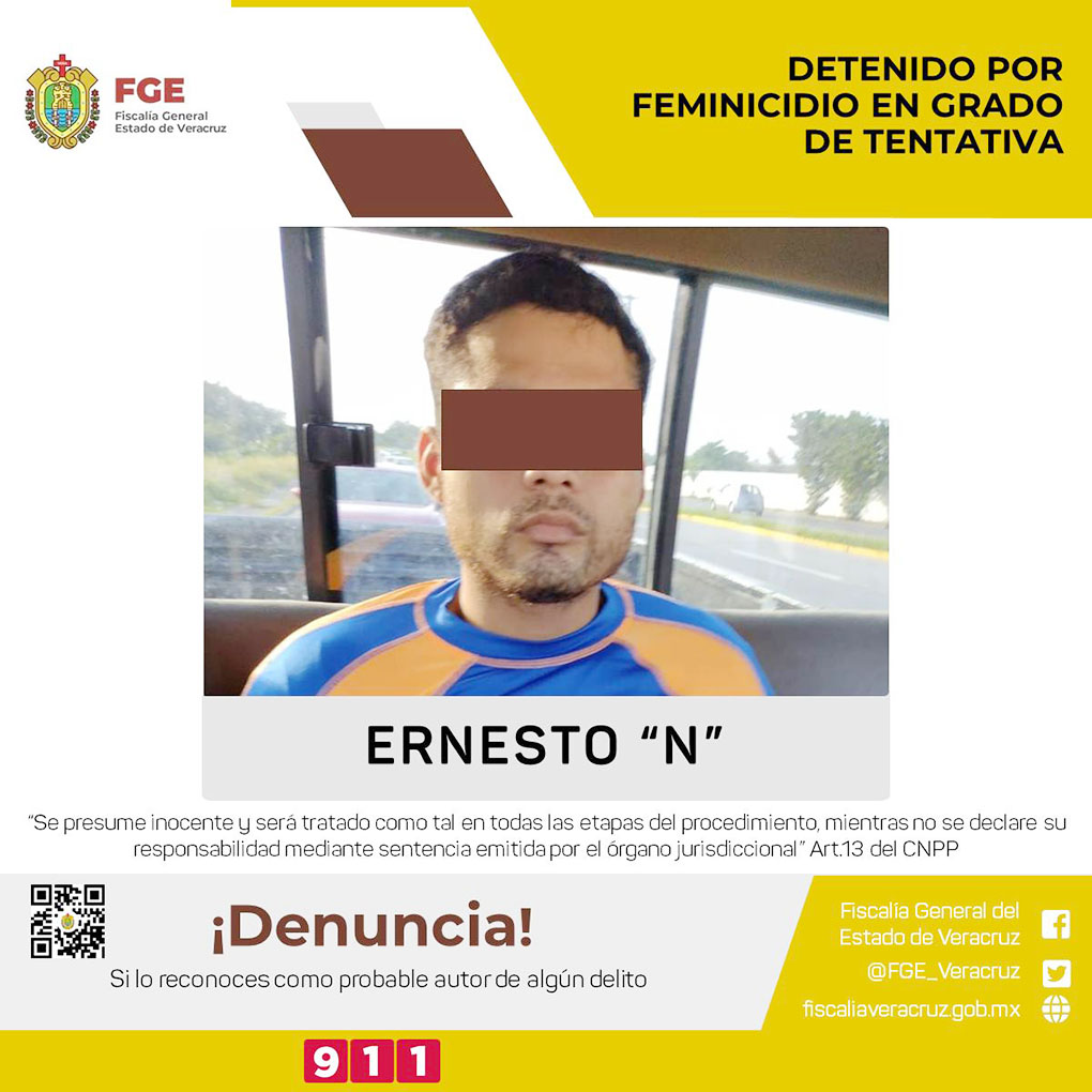A Ernesto “N” se le atribuye probable responsabilidad de hechos ocurridos el pasado 31 de agosto del año en curso, cuando presuntamente lesionara de gravedad a una víctima, quien resultara ser su pareja sentimental, la cual fue trasladada al Hospital Regional de la ciudad de Veracruz.