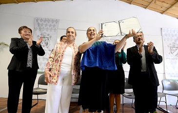 Al recibir el acta de acreditación, la Rectora de la UV entregó el documento al director de la Facultad de QFB, Eduardo Rivadeneyra Domínguez, acompañada de Leticia Rodríguez Audirac, secretaria Académica, y de Laura Elena Martínez Márquez, directora de Planeación Institucional.